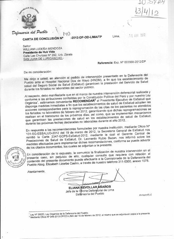 Las autoridades pueden hacerse de la vista gorda, pero «a la hora de la hora», no pueden renunciar a su deber. Nosotros los emplazamos y la defensoría del Pueblo, los puso contra la pared. Para el sistema de EsSalud, las quejas son una oportunidad para corregir y cumplir con la ley.